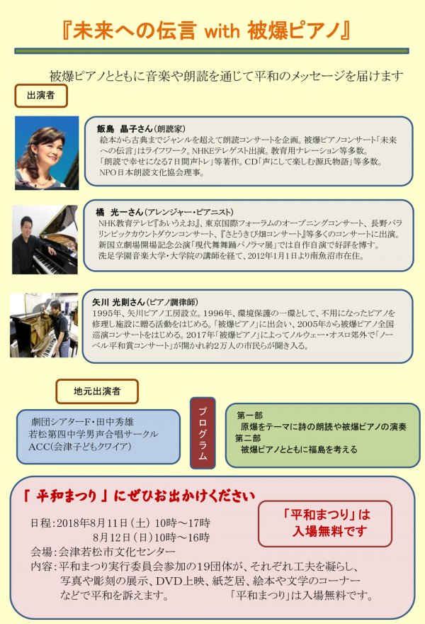 8月12日(日) 会津平和祭りで被爆ピアノコンサート 会津若松市文化センターで開催!