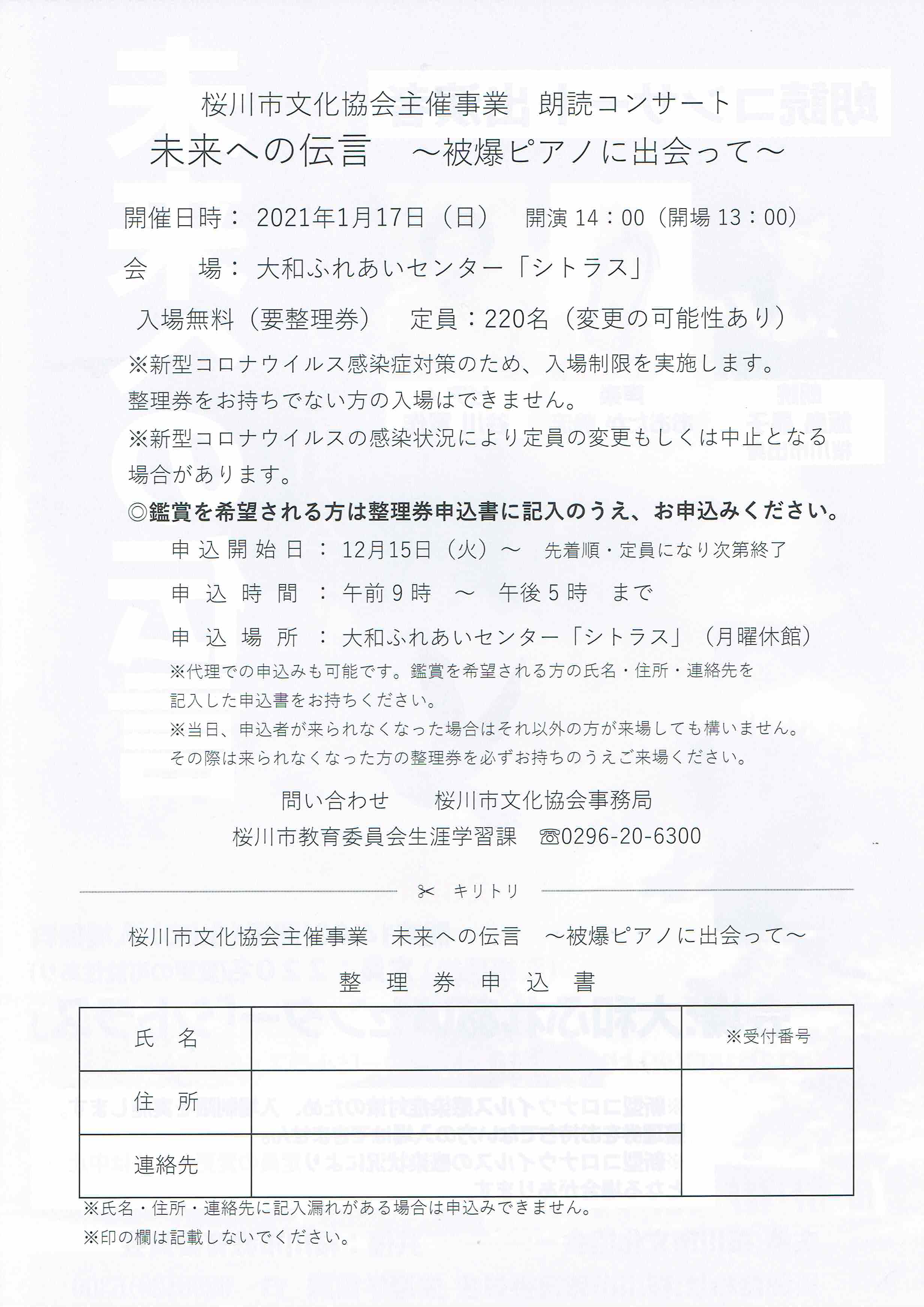 桜川市文化協会主催「未来への伝言」コロナ感染症防止のため延期となりました。