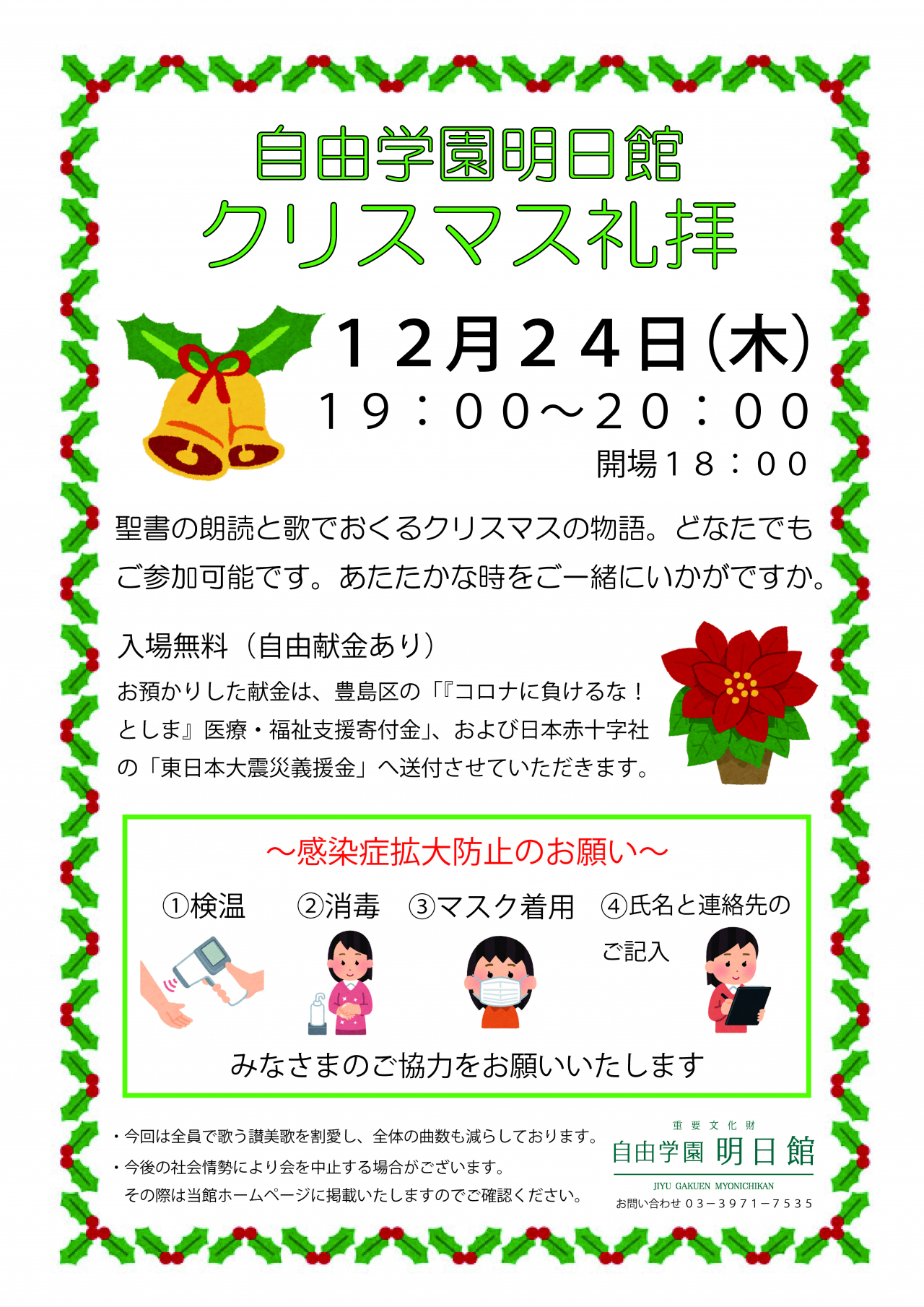 自由学園は創立時よりキリスト教に基づく教育を行い、創立時の校舎である明日館でも、かつて毎朝礼拝が行われていました。その雰囲気を感じていただける、どなたでもご参加可能なクリスマス礼拝を開催いたします。聖書の朗読と歌でおくるクリスマスの物語。あたたかな時をご一緒にいかがでしょうか。